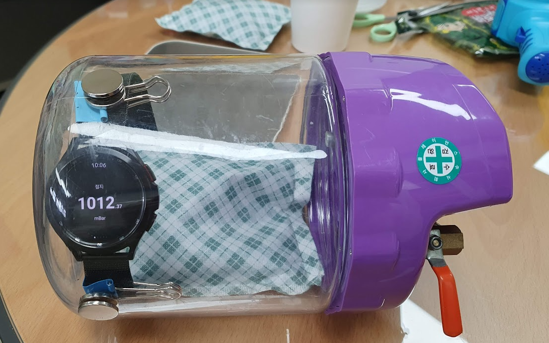 밀폐된 병안에 산소가 줄어든다면 기압도 감소할 것이다. 갤럭시워치 기압계를 넣고 실험해 보았는데 실패했다.