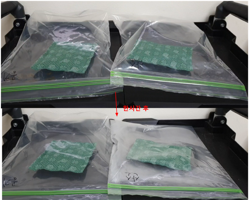 우선 지퍼백에 핫팩을 넣고, 공기를 가득 채운 후, 반응이 일어난 후 지퍼백 부피변화를 관찰해 보았다. 어느정도 부피가 줄어드는 걸 볼 수 있었다. 산소가 다 소모되면 더이상 부피가 줄어들지 않는다.