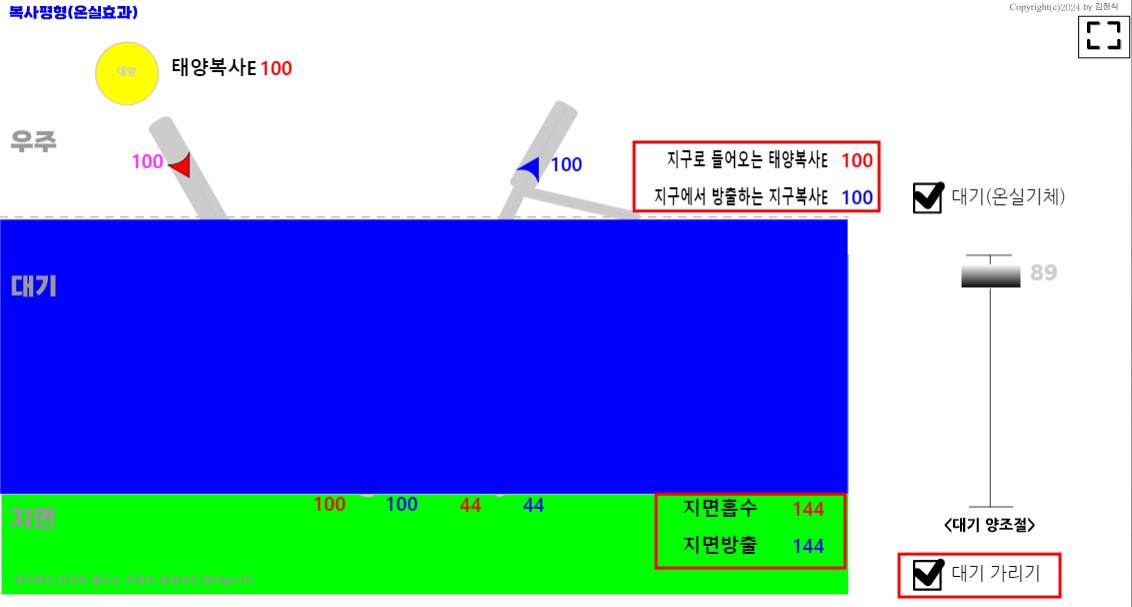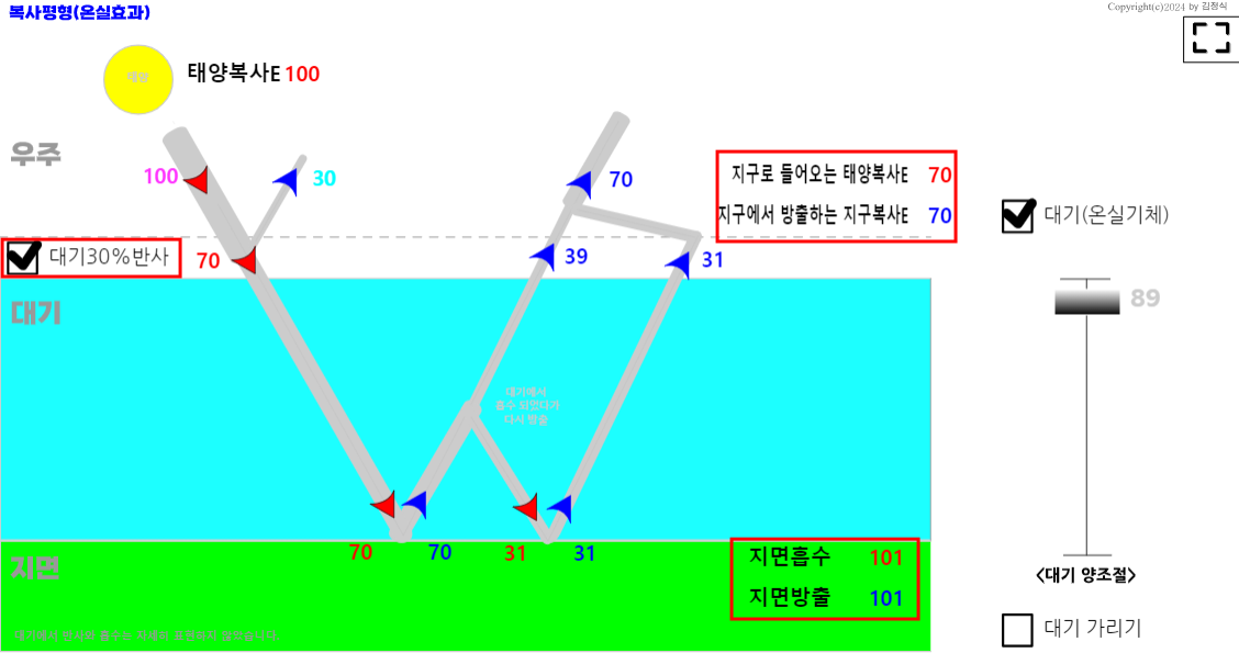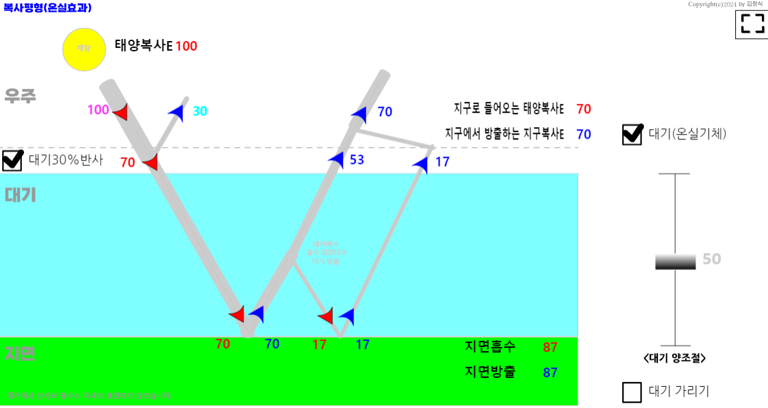 학생들이 대기가 있어도 태양복사E 가 100% 지구로 들어온다는 오개념을 가질 수 있을 것 같아서 대기 30%반사 기능을 추가했다. 대기가 진해지면 반사율이 더 많아 질 것 같은데, 이론적 해석이 없어서, 그냥 대기만 있으면 30% 반사한다고 가정하고 설명하도록 했다.