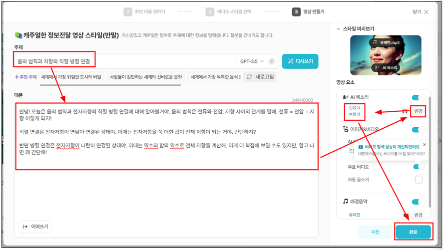 제목만 넣고 쓰기를 눌러도 내가 대본을 직접 적지 않아도 인공지능이 자동으로 만들어 주기도 한다.