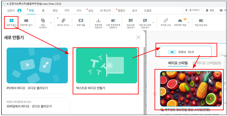 '새로만들기' – '텍스트로 비디오 만들기' – '유튜브 16:9' – '비디오스타일' 을 고르고 다음을 누른다.