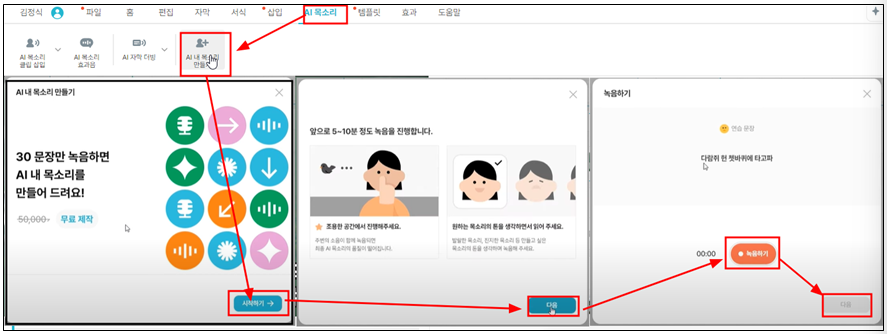 'AI 목소리' – 'AI 내목소리 만들기'를 선택하고 시작하기를 누르면 된다.