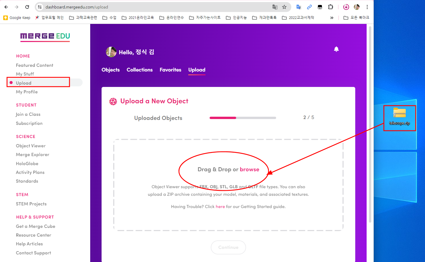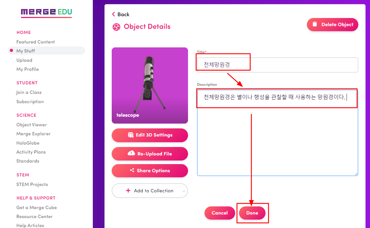 sketchfab 에서 3D 물체를 다운 받아서 merge edu 사이트에 올리고, 스마트기기에서 Object Viewer 앱으로 관찰하면 된다.