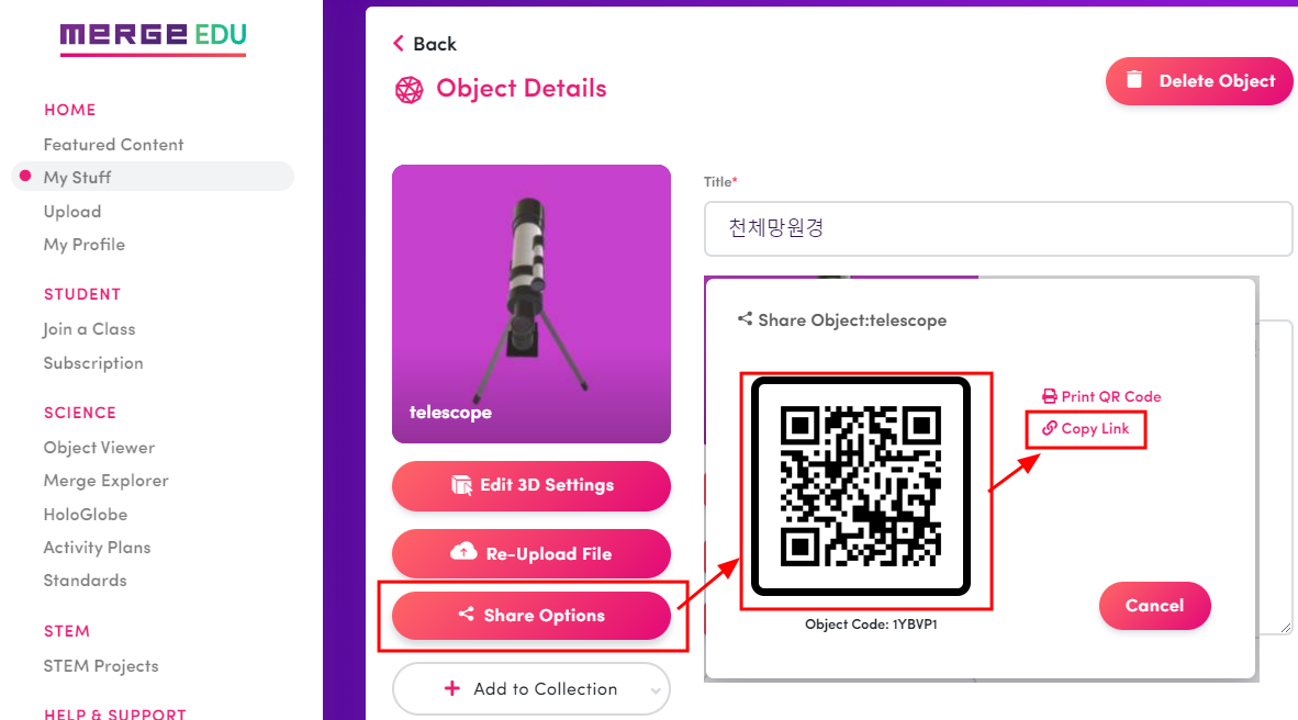 7. 학생들과 공유하는 방법은 My stuff 에 가서 3D물체를 선택하고 Share options 를 눌러 학생들에게 공유해 주면 된다.
