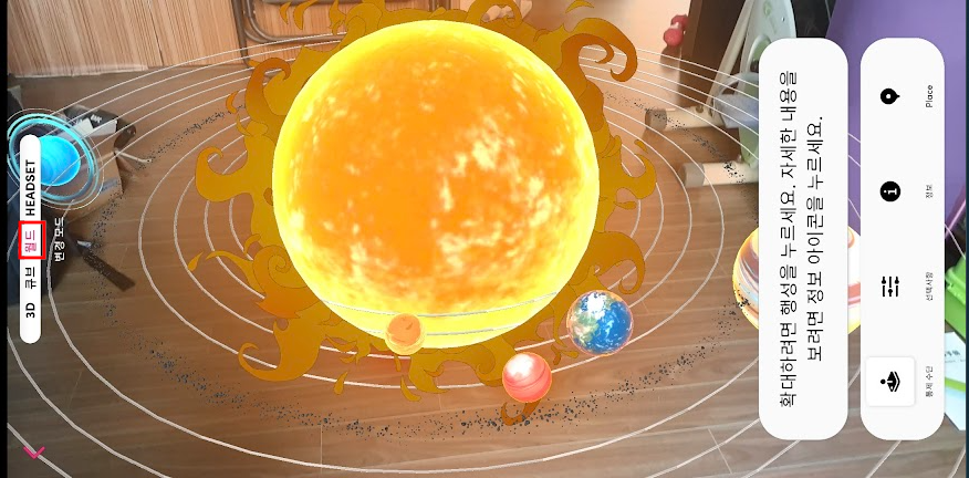4. 월드를 선택하고 책상이나 바닥에 비춰주고, 위치를 선택해서 눌러주면 태양계가 나타난다.