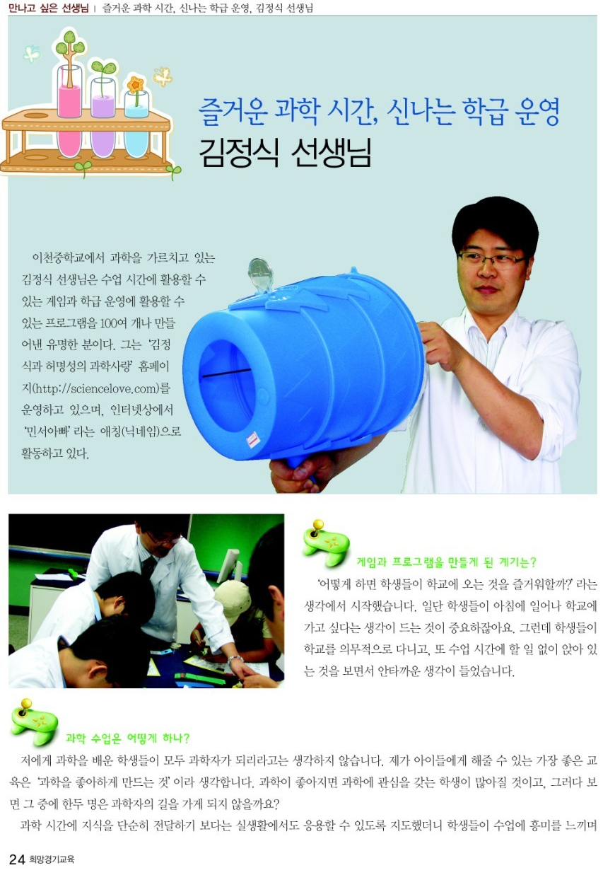 과학관련자료/과학업무자료 2008년 8월호 희망경기교육에 실린 민서아빠 기사내용 by 민서아빠(과학사랑) 2008. 9. 7. 2008년 8월호 희망경기교육에 만나고 싶은 선생님으로 기사가 실렸답니다.아래는 링크 주소이구요 http://ebook.goe.go.kr/home/view.php?code=1110&searchkey=&searchval=&host=main&site=20080808_093523&listPageNow=1&list2PageNow=1 아래는 기사내용입니다. 공유하기 게시글 관리 김정식 허명성의 과학사랑 관련글 과학수업에 대한 고찰 - 원고 물로켓 만드는 방법 과학실 현대화 자료 재미있고 기다려지는 과학수업을 만들어라