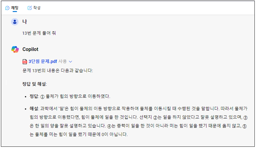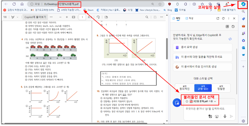 - 윈도우용 코파일럿이 아니라 엣지 안에 있는 코파일럿을 실행해야 한다. 그리고 질문을 하면 현재 열려 있는 문서와 관련된 질문과 답변을 받을 수 있다.