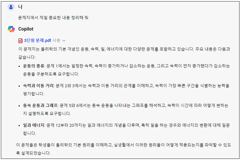 - 윈도우용 코파일럿이 아니라 엣지 안에 있는 코파일럿을 실행해야 한다. 그리고 질문을 하면 현재 열려 있는 문서와 관련된 질문과 답변을 받을 수 있다.