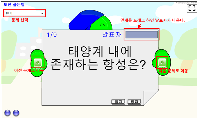 2. 문제가 출제 된 후 발표자 옆에 덮개를 누르면 발표자가 나온다. 덮개를 드래그 해서 발표자 이름을 조금씩 보여 줄 수도 있다.)