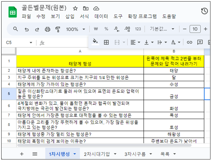 2. 복사한 '문제 구글스프레드시트'에 본인만의 문제를 입력한다.
