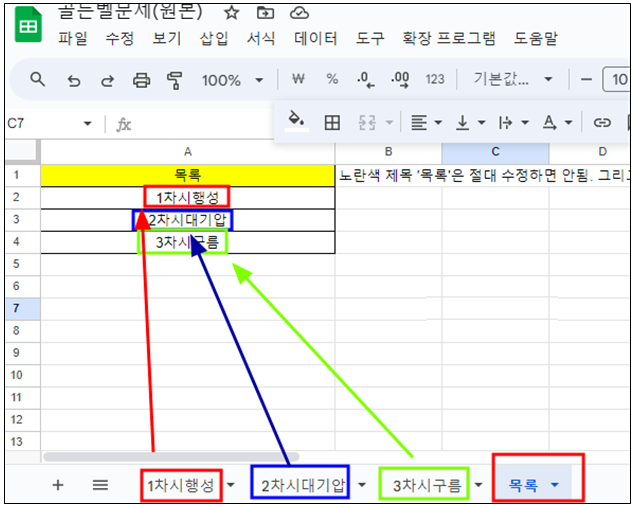 - 목록 시트에는 각 반 시트명을 입력한다.