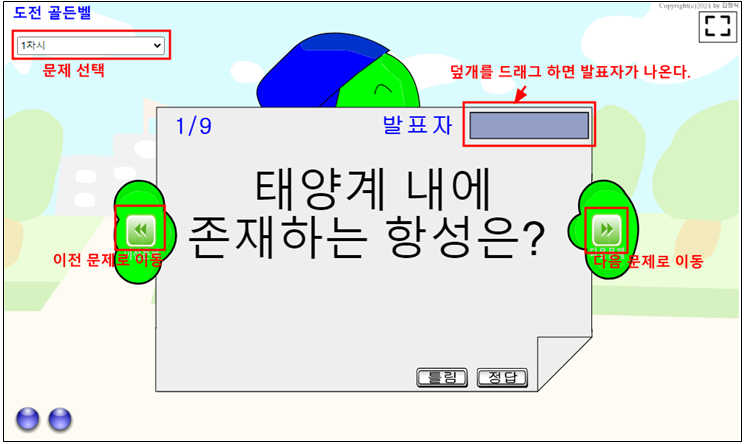 2. 문제가 출제 된 후 발표자 옆에 덮개를 누르면 발표자가 나온다. 덮개를 드래그 해서 발표자 이름을 조금씩 보여 줄 수도 있다.)
