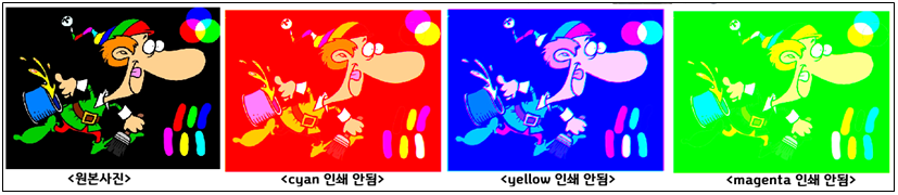 칼라 인쇄물이 제대로 안나올 때 살펴 보면 어떤색 잉크가 떨어졌는지도 알 수 있다.