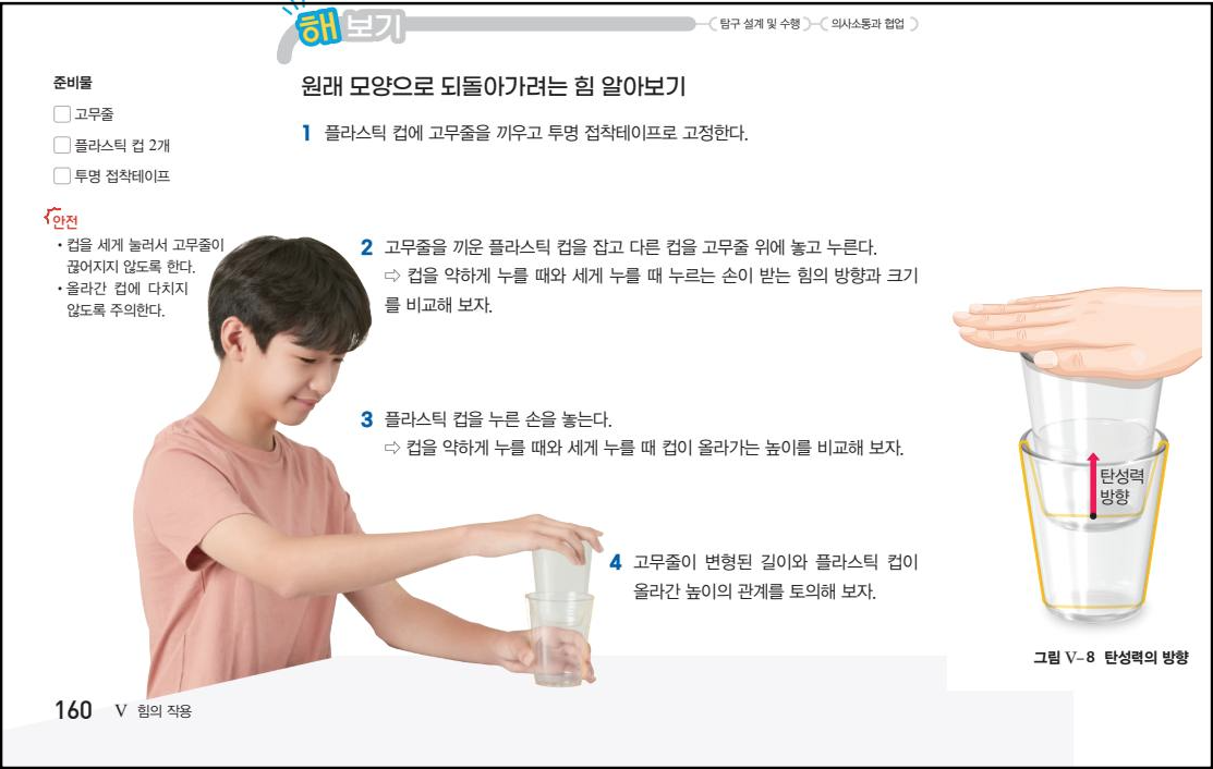 컵2개와 고무줄로 직접 만들어서 놀아 보면, 탄성력의 방향과 크기를 쉽게 알 수 있다.