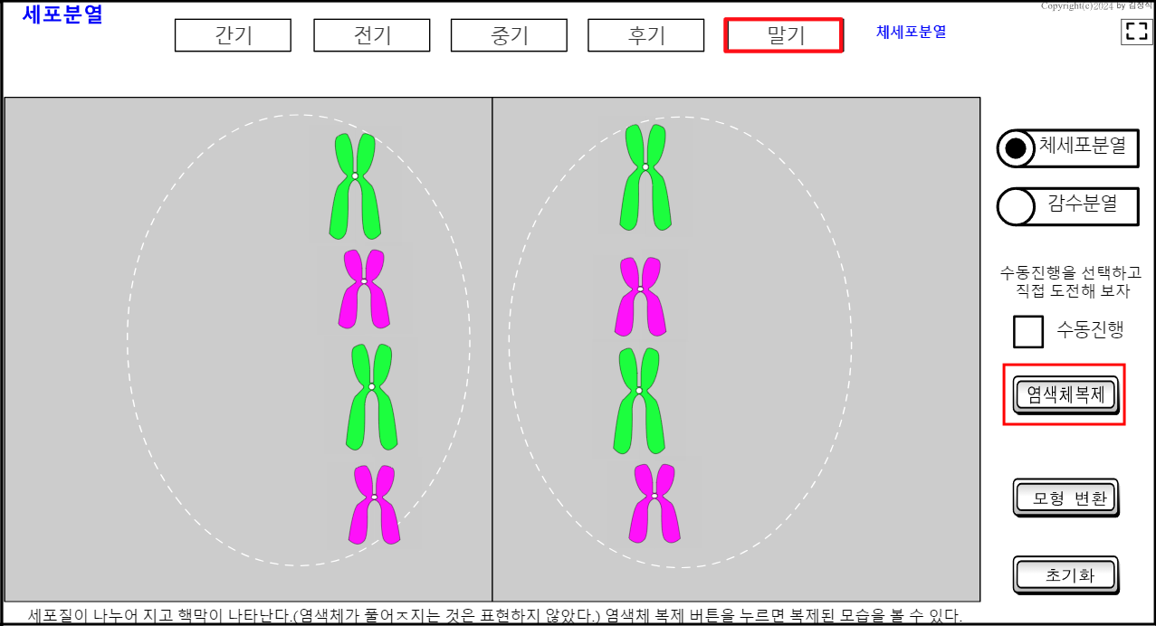 이 버튼을 누르면 염색분체가 다시 염색체로 변하게 되고, 모세포의 염색체와 같은 모양이 된다.