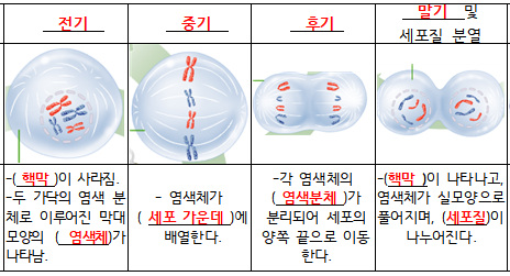 과일 모양 대신, 체세포분열의 전기, 중기, 후기, 말기 사진을 넣었다.