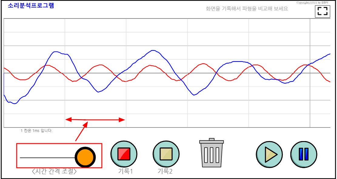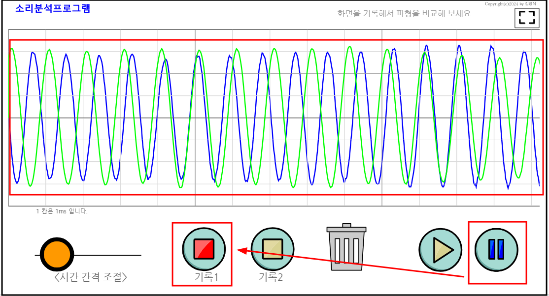 소리를 발생시키고 일시 정지를 눌러 소리파형을 일시 정지 시킨다. 마음에 드는 파형이 그려졌다면, 기록1을 눌러 화면에 기록한다.