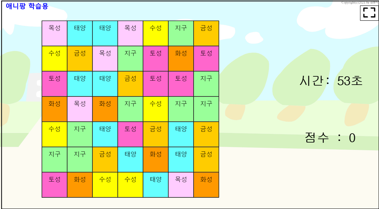 애니팡 학습용 게임(연관용) - 유사한 내용으로 학습아래 링크에서 애니팡 학습용 게임 연관용을 만들어 사용하면 된다.https://sciencej.cafe24.com/html5/anipang/anipangmaker3.html같은 단어만 일치 시키는 것