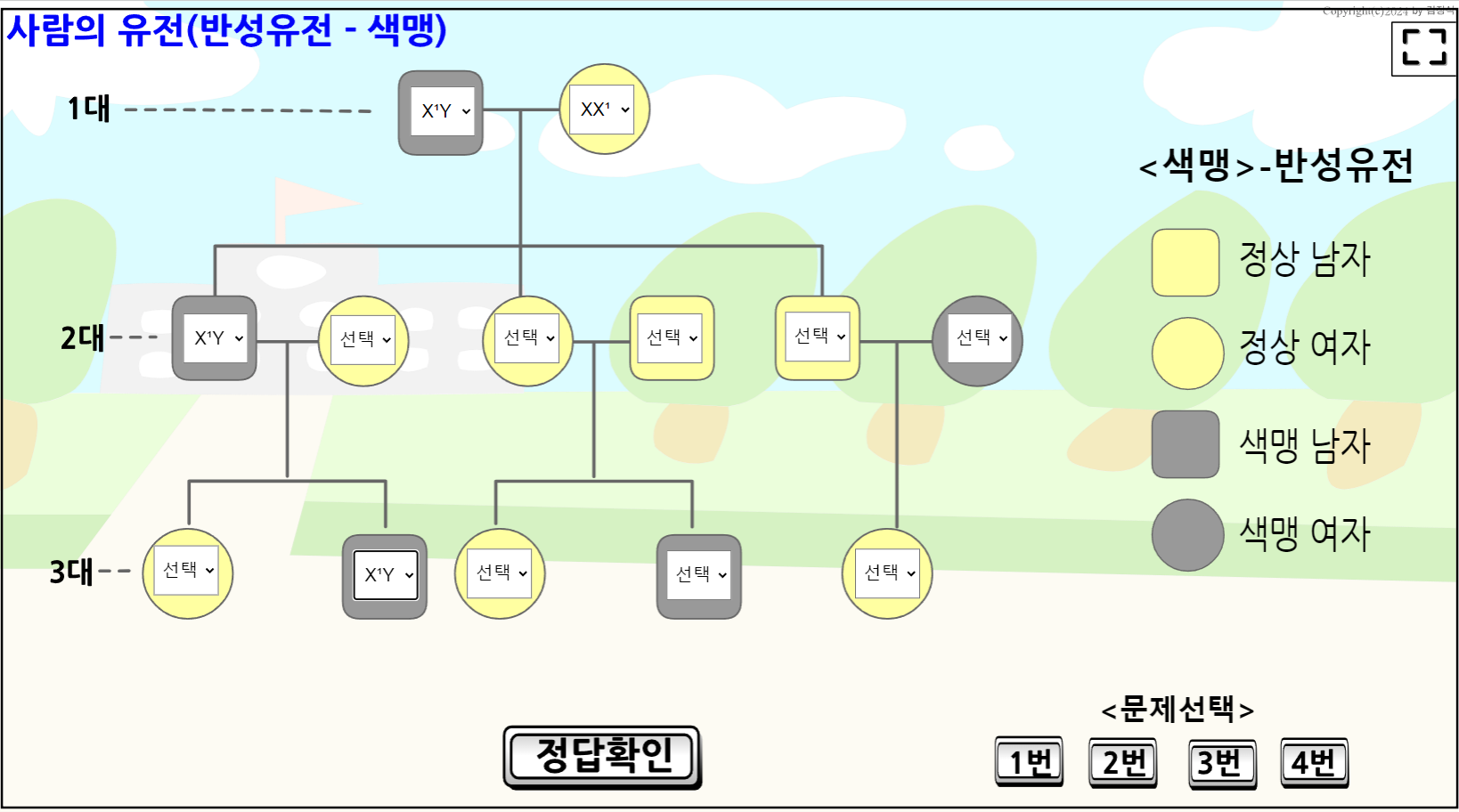 유전단원에서 가계도 분석하는 가상실험이다. 중학교 수준이라 상염색체 유전만 만들었다. 사람의 가계도 지만 5번 문제에 완두의 가계도도 추가 했다. 학생들 이해시키기 쉽다. 별다른 기능