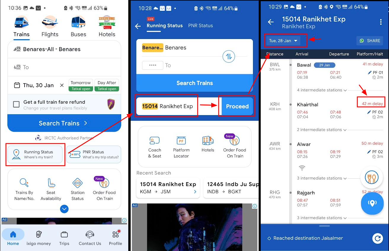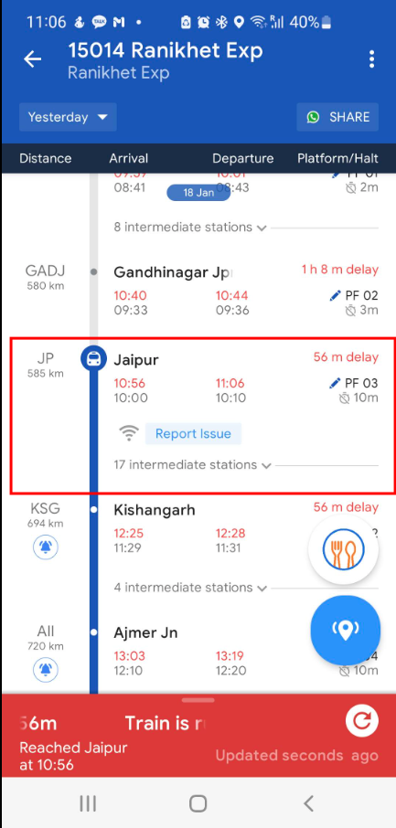 ixigo train 앱에서 내가 탈 기차번호를 누르고 들어가면 좌측 상단에서 날짜를 선택할 수 있다. 그럼 어제, 또는 그저께 운행했던 기차가 우리역에 얼만큼 딜레이 되었는지 확인이 가능하다. 그럼 오늘은 얼만큼 늦을지 대충 알 수 있다.