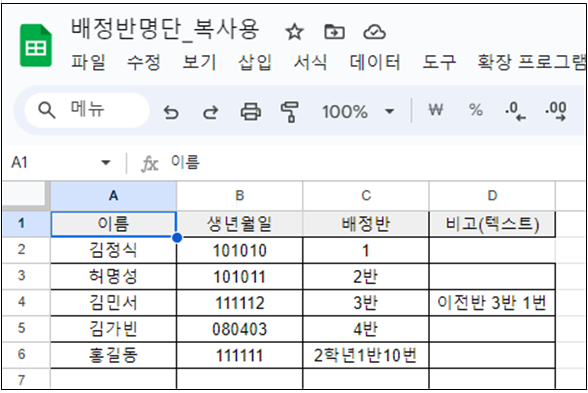 1) 아래 링크에 있는 구글스프레드 시트를 사본 복사해서 명단 붙이기 시트에 형식에 맞게 명단과 배정반을 작성한다. (공유하지 않고 비공개로 둔다) - 2000명까지 사용가능하다.