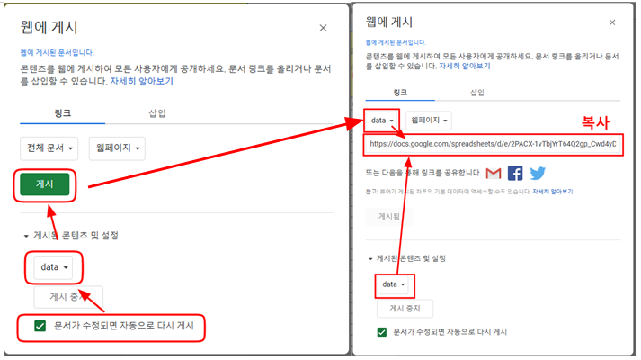 3) 아래 그림처럼 게시를 누르고 그 다음 웹에 게시할 때 반드시 data 시트만 선택해서 웹페이지로 게시를 한다. - 다른시트는 웹게시 하면 안됨.