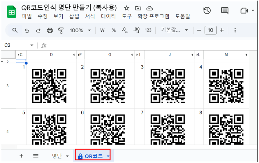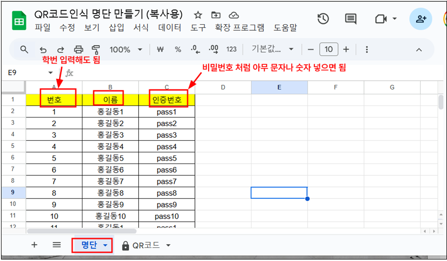 다. 구글스프레드시트에 번호, 이름, 인증번호를 넣어서 명부를 만들면 QR코드 시트에 자동으로 QR코드가 만들어 진다.