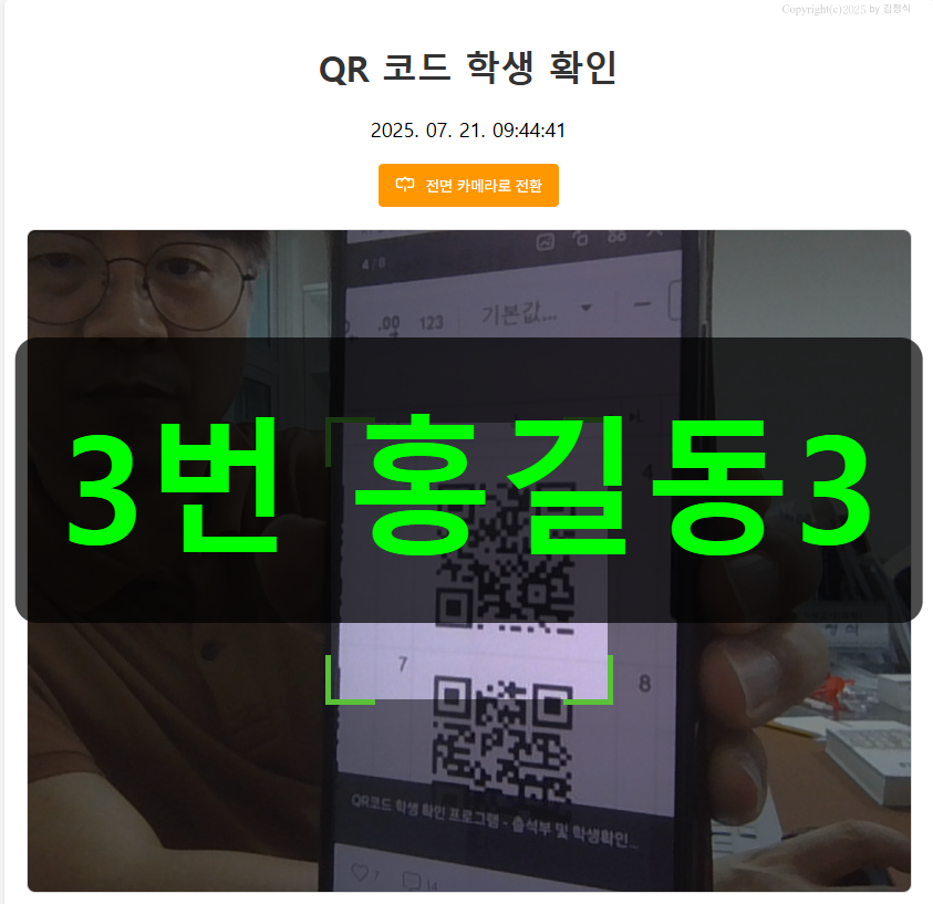 학생들이 자신의 QR코드가 인식되었는지 몰라서 계속 QR코드를 들이댄다는 의견이 있어서, 인식 되면 본인 번호와 이름이 나오게 추가 했다. 1초간 본인 이름이 나온다.
