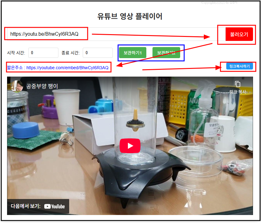 * 업데이트 : 불러오기를 누르면 영상위에 짧은 주소가 나타난다. 시작시간과 끝시간이 필요 없으면 짧은 주소를 복사해서 사용하면 된다. 단 짧은 주소의 경우 시작시간과 끝시간을 설정할 수 없다.