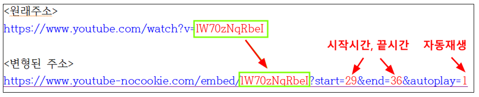 https://www.youtube-nocookie.com/embed/{링크주소}?start={시작시간}&end={종료시간}&autoplay=1