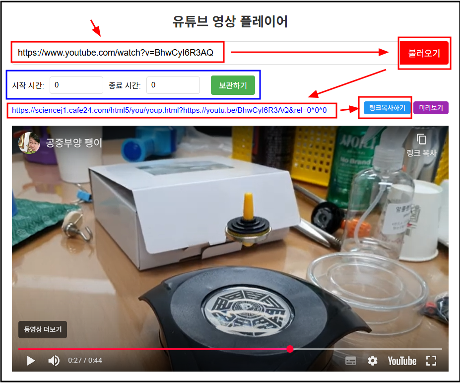 * 업데이트 : 불러오기를 누르면 영상위에 링크 주소가 나타난다. 시작시간과 끝시간이 필요 없으면 링크 주소를 복사해서 사용하면 된다. 필요하면 시작시간과 끝시간을 설정한 후 보관하기 버튼을 눌러 링크 주소를 복사해 가면 된다.