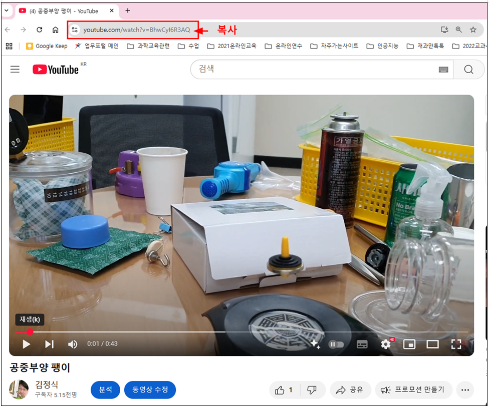 1. 수업시간에 보여주고 싶은 원하는 유튜브 영상을 먼저 찾고 링크 주소를 복사한다.