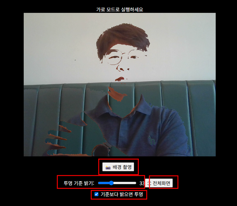 하얀색을 투명하게 하는 경우아래 동영상처럼 하얀색 종이를 들고 움직이거나 하얀 옷을 입고 있으면 하얀색 부분만 투명해 진다.