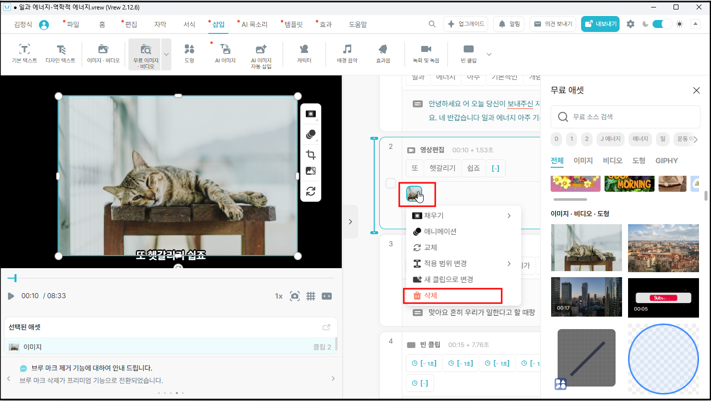 삽입 무료 이미지 비디오를 선택해서 우측에 무료에셋이 나타나게 하고, 클립을 선택한 다으 무료에셋에서 검색한 영상을 더블클릭하면 다시 그 클립에 적용된다.