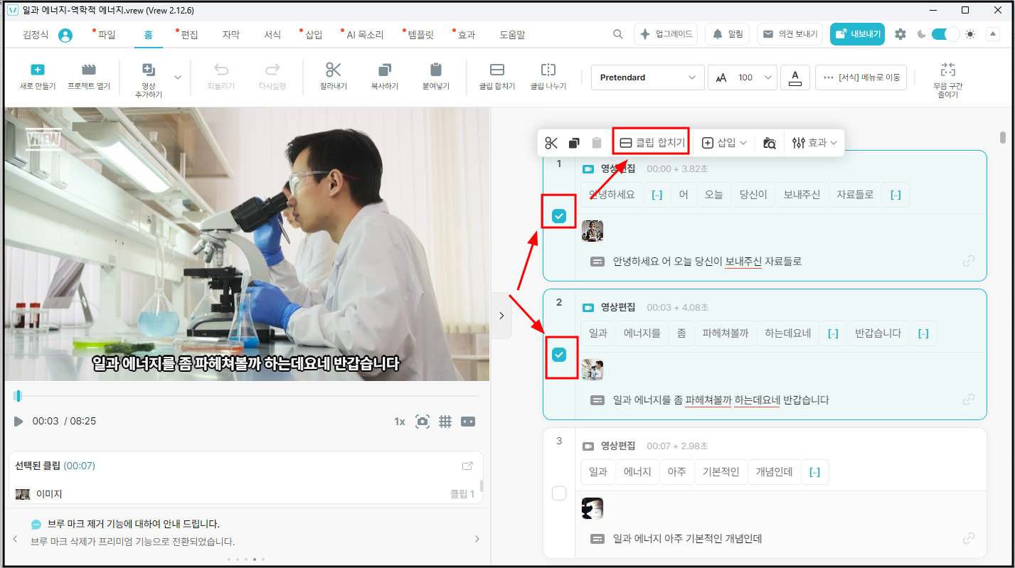 클립을 합치거나 분리 할 수 있다. 자막이 너무 짧은 경우에는 두 클립을 합쳐 주면 된다.