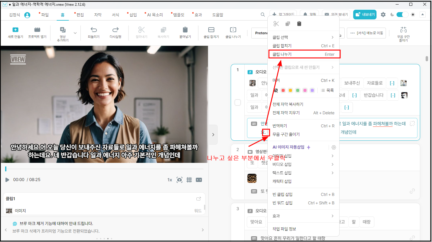클립이 너무 긴 경우나 자막이 넘어가는 부분이 어색한 부분은 찾아서 마우스로 선택하고 우클릭 후 클립나누기를 눌러 클립을 분리해 준다.