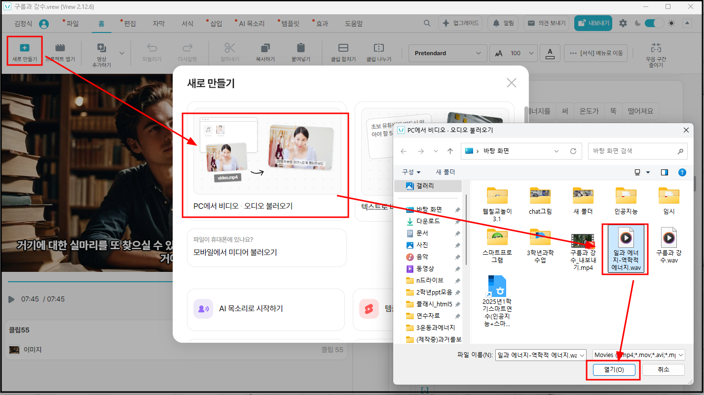 1. 프로그램 실행하고 새로만들기 - pc 에서 비디오 오디오 불러오기를 선택하고 대화 파일을 불러 온다.