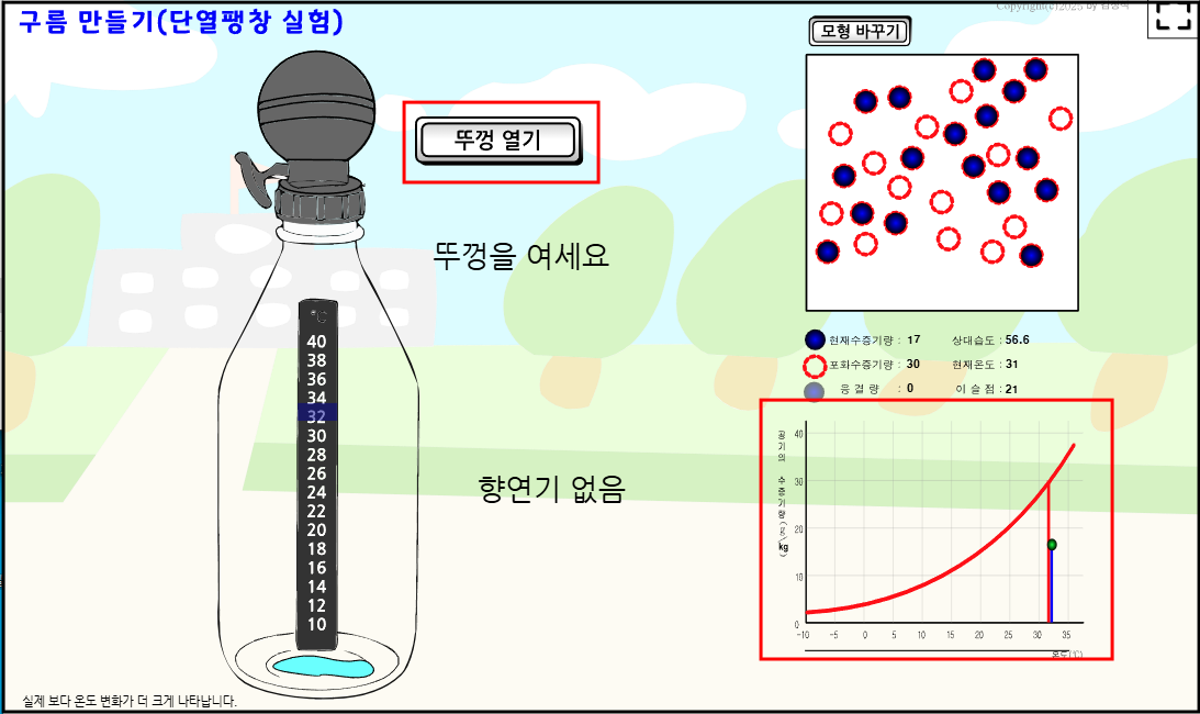 뚜껑 열기를 눌러 단열팽창을 시키면, 온도가 내려가면서 병 안에 뿌옇게 흐려지는 것을 확인할 수 있다.