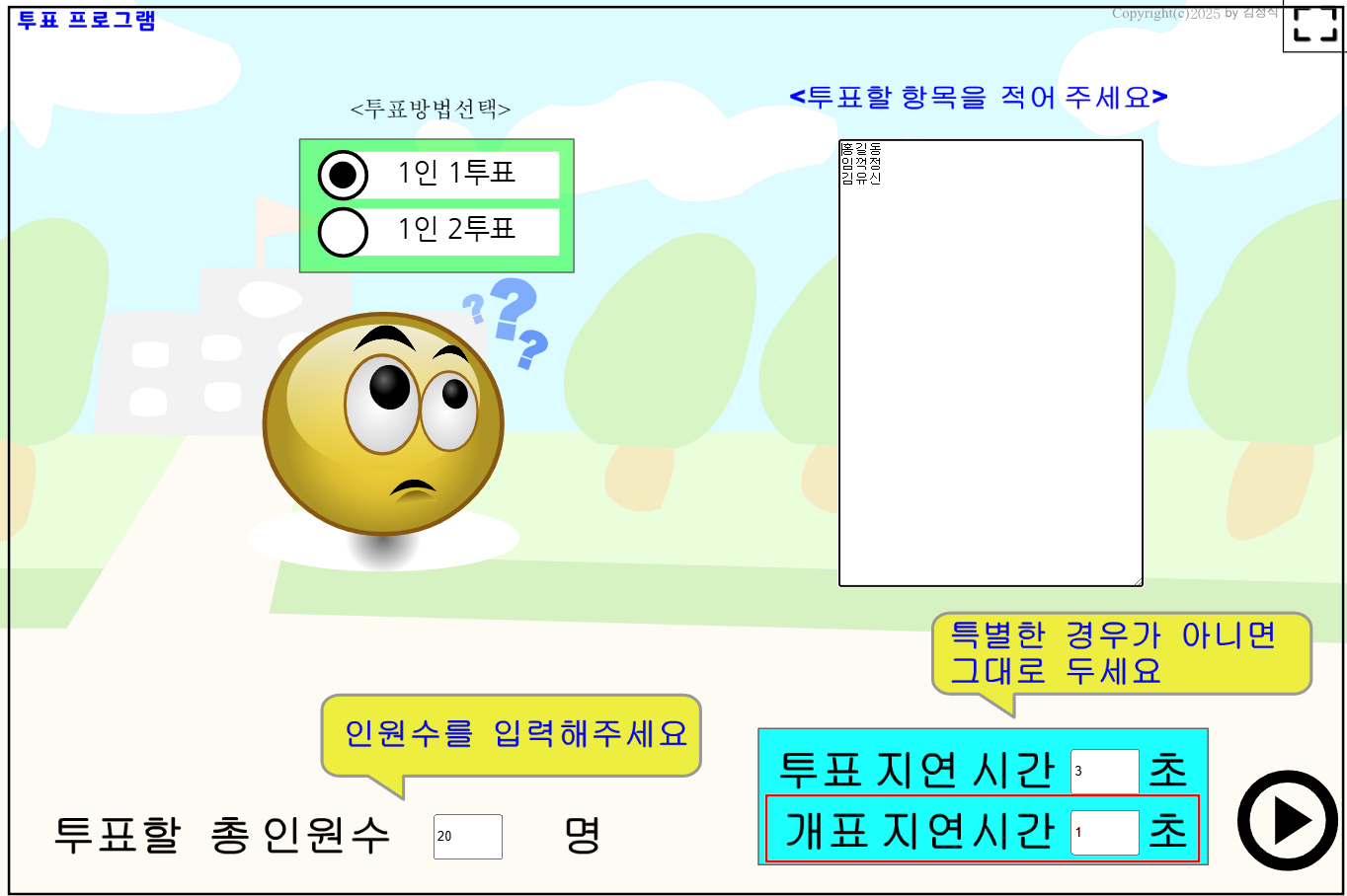 그리고 투표인원이 많아지면(전교회장 선거 같은 경우) 개표하는데 시간이 오래 걸리기 때문에 개표하는 시간도 조절할 수 있는 기능을 추가했다. (예를 들어 투표할 총인원수가 500명이라면 개표지연시간이 1초인 경우 개표하는데 최대 500초가 걸린다. 이런 경우에 개표지연시간을 0.1초로 줄이면 최대 50초 안에 개표를 끝낼 수 있다)