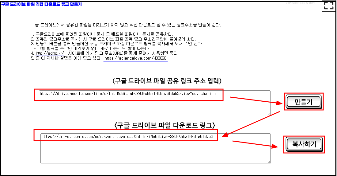 2. 아래 링크에 가서 구글 드라이브 파일 공유링크 주소를 입력하고 만들기를 누르면 다운로드 할 수 있는 링크가 만들어 진다.