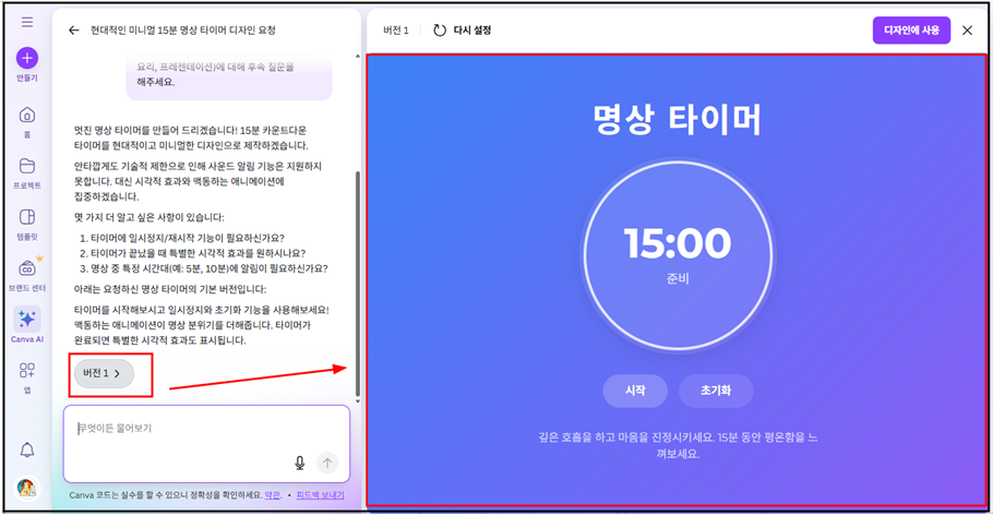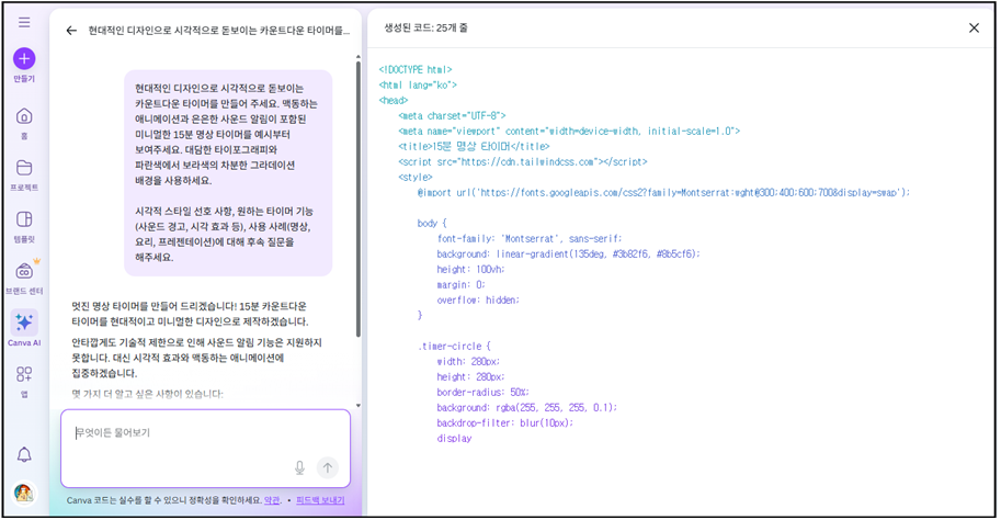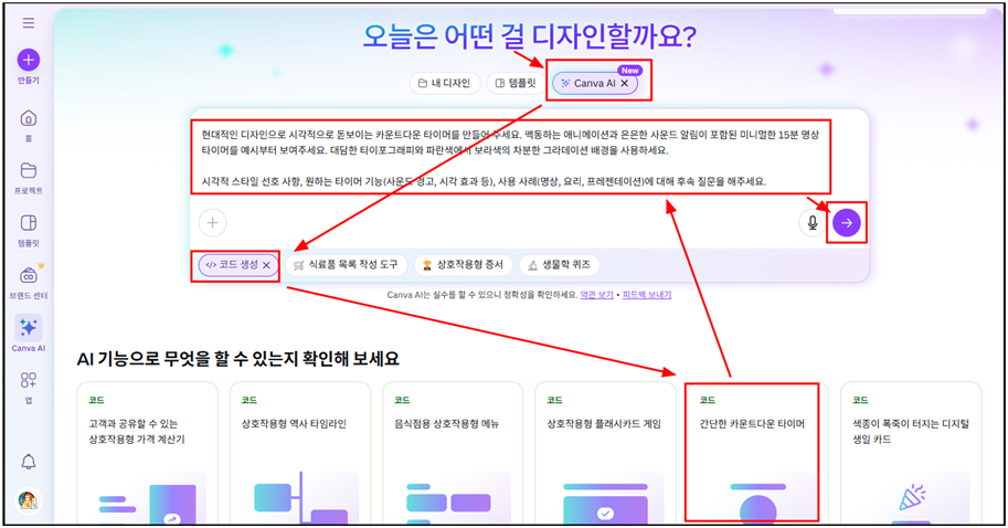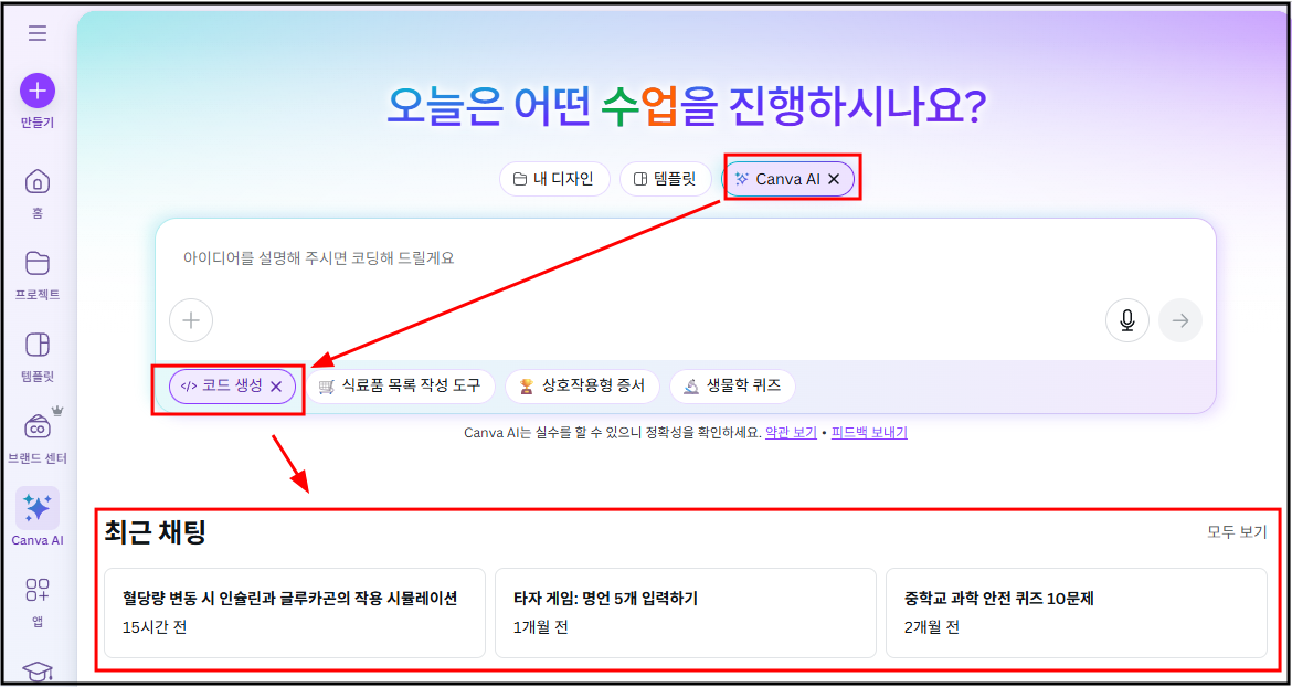 캔바 홈에서 - 캔바 AI를 선택하고 - 코드 생성을 선택한다.