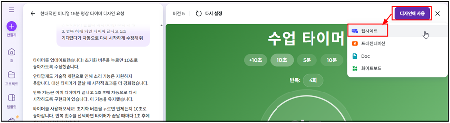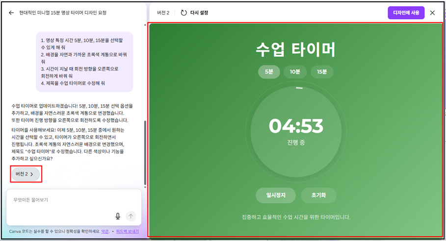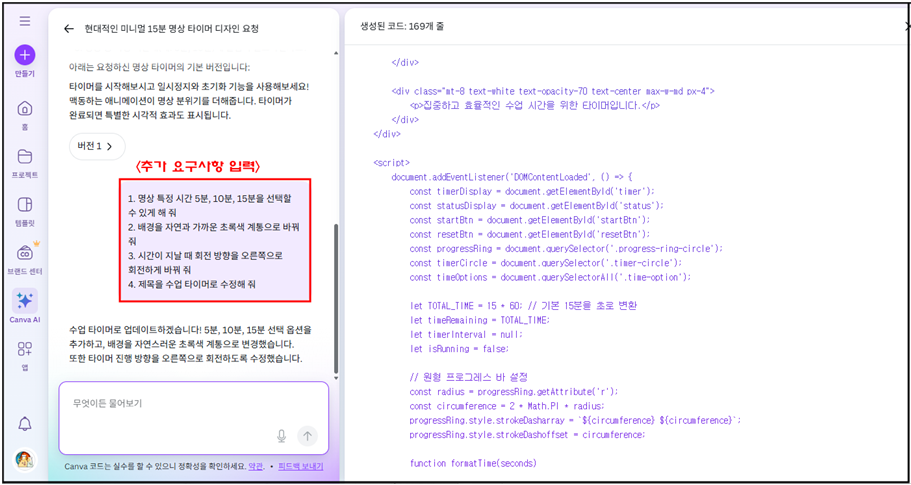 - 간단한 카운트 다운 타이머를 누르면 입력창에 아래 프롬프트가 자동으로 써진다.