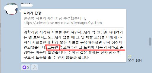 '인공지능이 만들어 준 코드를 보고 있으니, 그동안 김정식 수석님은 인공지능 처럼 500-1000줄의 코드를 직접 쳐서 만드셨다니 정말 대단하세요. ' 라고 하시면서 마지막 한마디 '그동안 고생 많으셨습니다.'