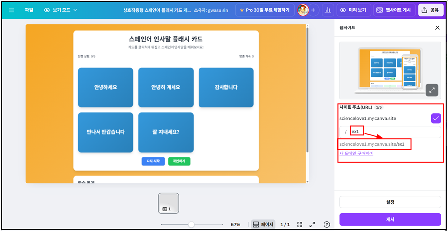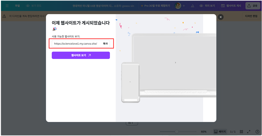 - 게시를 누르면 학생들에게 제공할 수 있는 웹사이트가 나타난다.