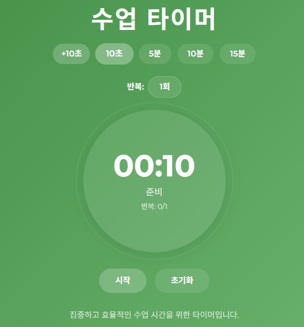 | 1. 시작 시간을 10초로 설정해 줘, 그리고 5분 시간 왼쪽에 +10초 버튼을 추가해서 누를때 마다 시간이 +10초씩 추가되게 수정해 줘 2. 반복 횟수를 1-10회 까지 선택할 수 있게 수정해 줘 - 반복을 선택하면 타이머가 끝났을 때 처음부터 다시 반복해서 자동으로 실행 되야 해 |