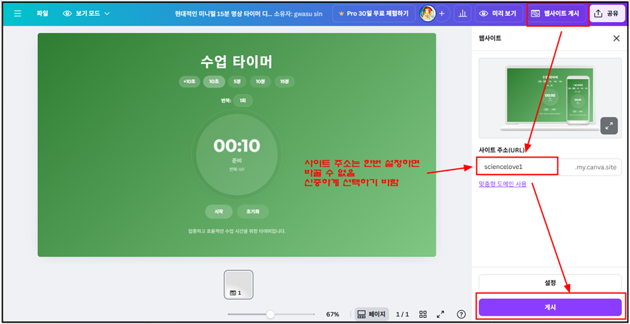 완성된 프로그램은 웹으로 출판해서 링크주소를 만들고, 학생들에게 보내서 접속해서 활용하게 하면 된다.