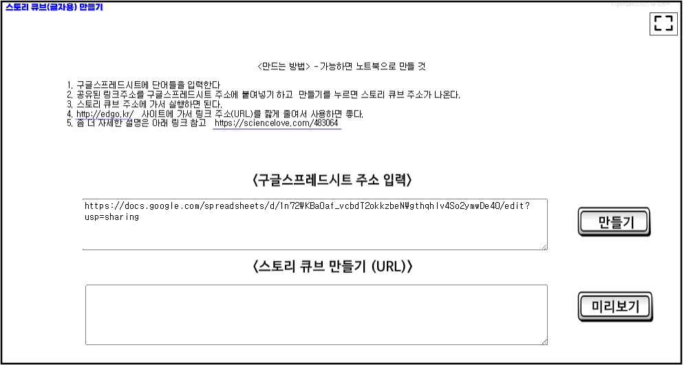 2. 아래 스토리큐브 만들기 사이트에 접속해서 복사한 구글스프레드시트를 붙여 넣고 만들기를 누른다.