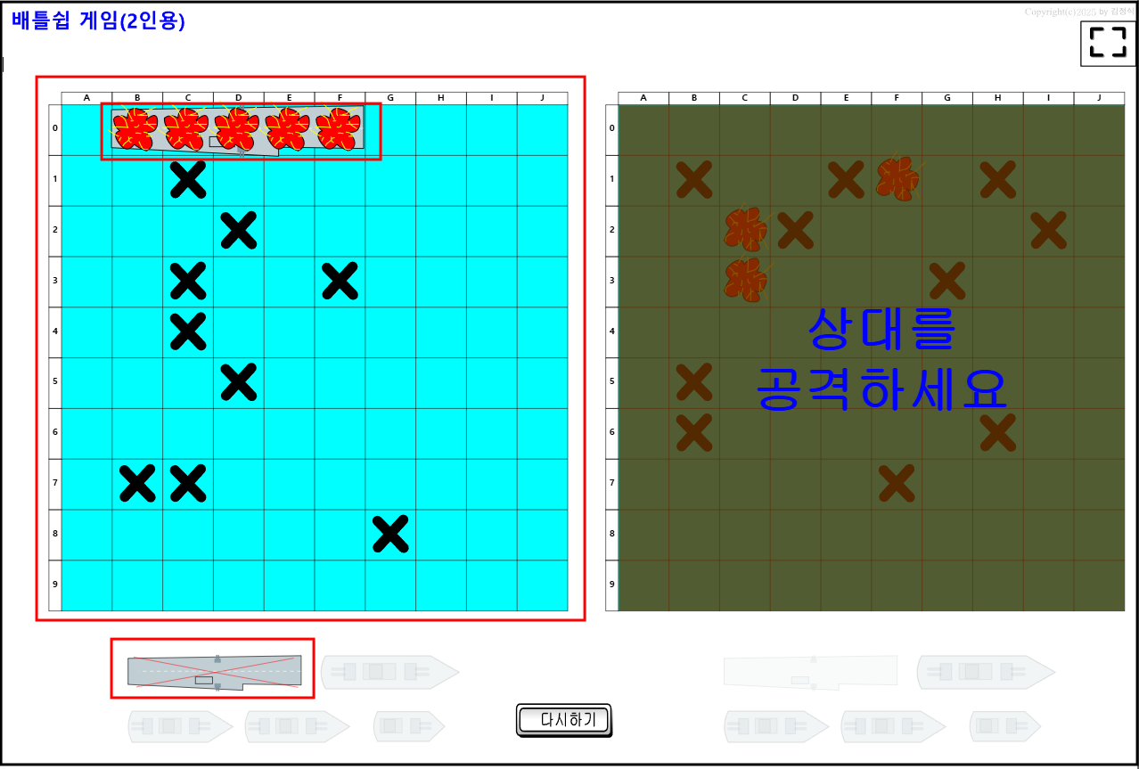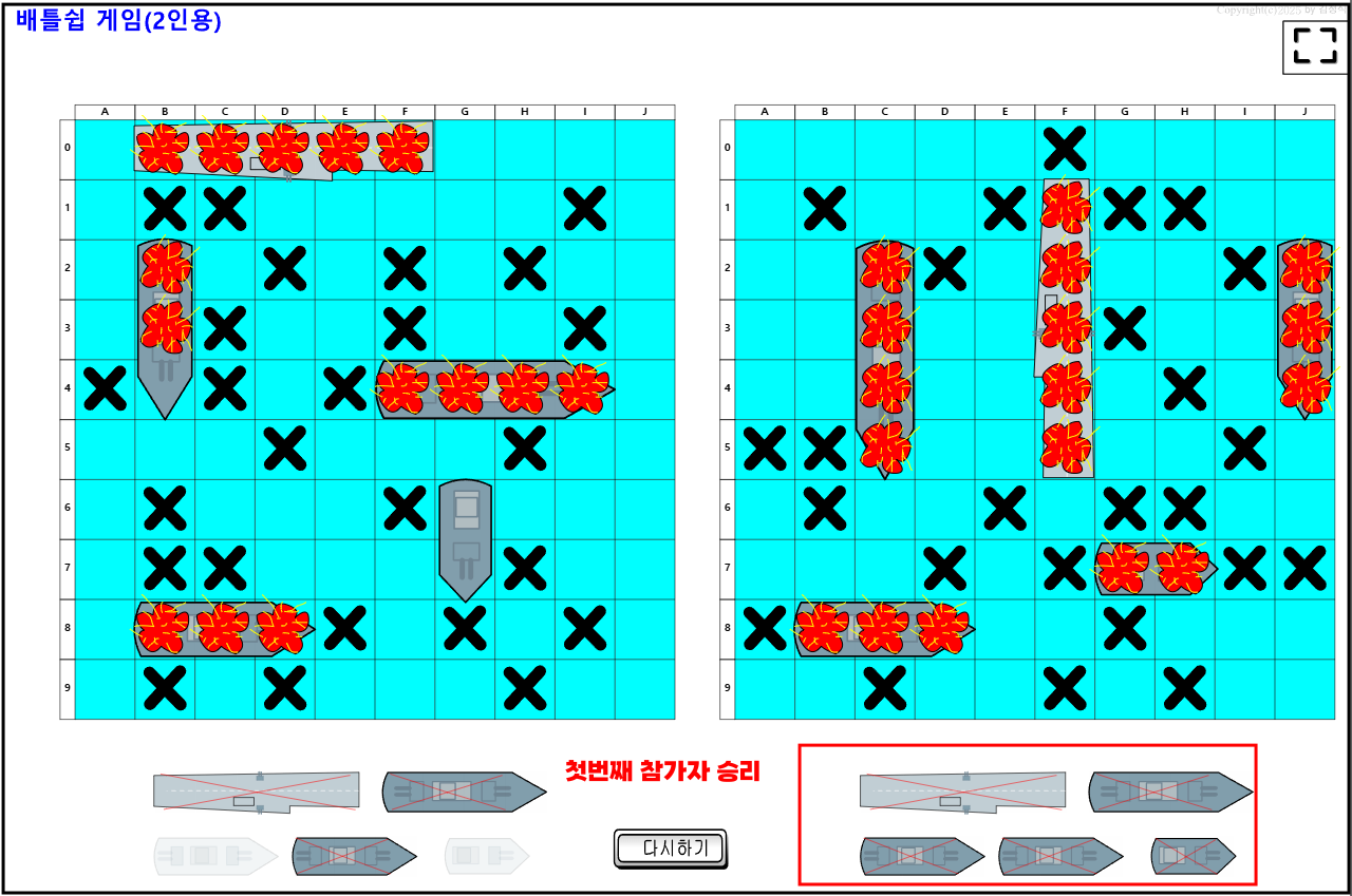 5. 같은 방법으로 번갈아 가면서 한쪽이 모든배를 다 파괴할 때 까지 게임을 하면 된다.