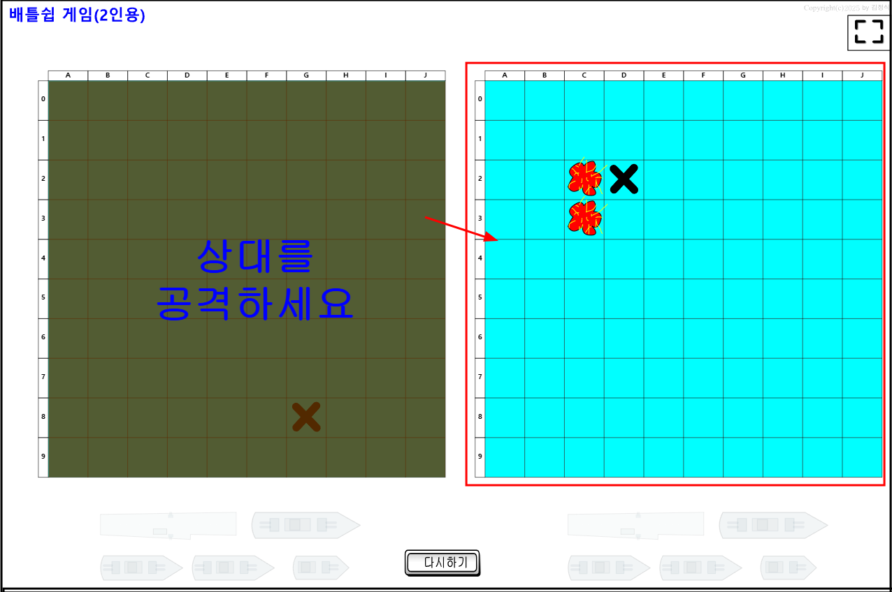 첫번째 참가자는 두번째 참가자 화면에서 원하는 좌표를 누른다. 만약 그 좌표에 배가 있으면 폭발이 일어나고 계속해서 다른 좌표를 공격할 수 있다.