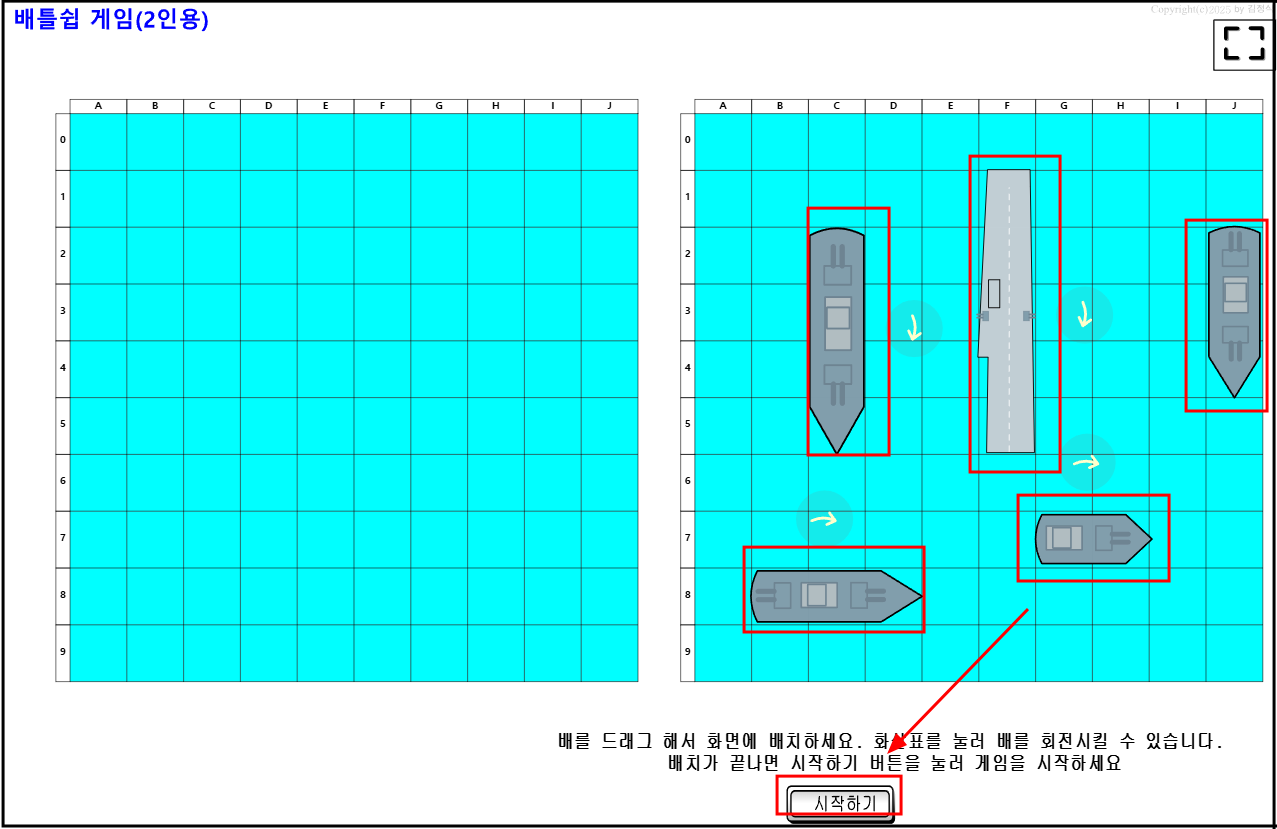 1. 첫번째 참가자는 두번째 참가자가 보지 못하게 하고, 먼저 배를 화면에 배치 한다. (두번째 참가자는 배치하는 화면을 보면 안된다.)